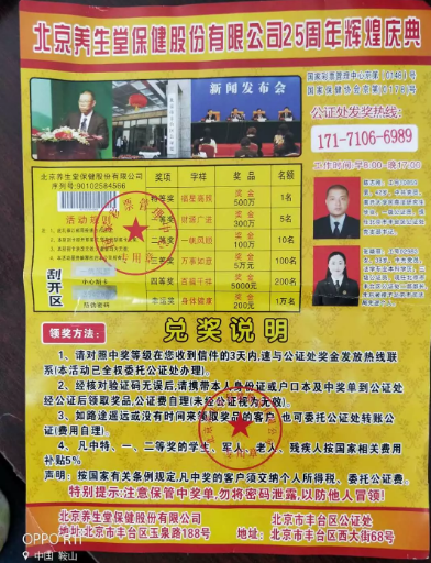 界首市公证处迎来了一位手拿“兑奖券”老人,该老人笑容满面的说道:“运气太好,中大奖了,来公证一下”。我处公证员立即上前接待,经详细询问发现老人是在某保健品广告中获得一张的中奖单