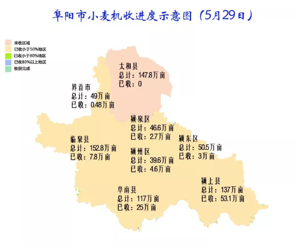 截止5月29日16时,全市已收割小麦96.68万亩,进度为13%,其中颍上53.1万亩,阜南25万亩;当日投入小麦联合收割机12782台(其中跨区作业联合收割机3349台),收割小麦61.2万亩;全市